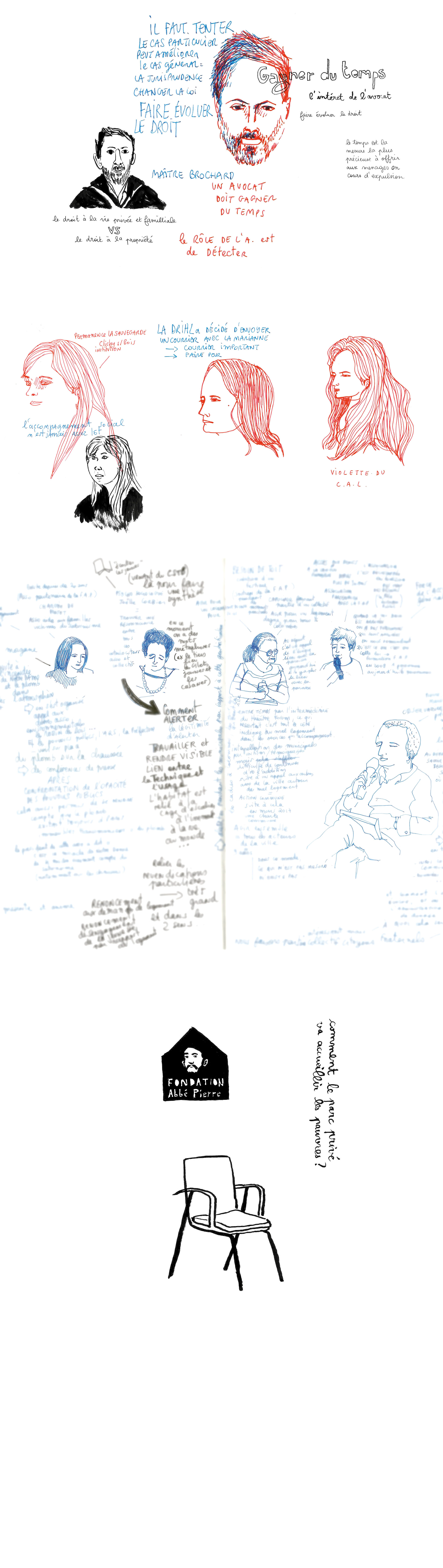 Coulisses d'un documentaire dessiné sur l'habitat et le mal-logement. Deux années de rencontres, d'échanges et d'ateliers participatifs en immersion à l'Espace Solidarité Habitat de la Fondation Abbé Pierre. [Regards croisés d'Anouk Migeon architecte-dessinatrice et Carole Chaix illustratrice]